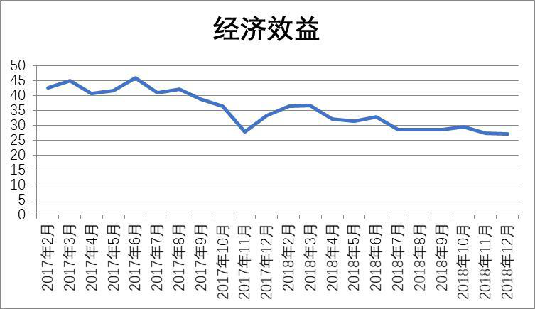 2018年第一季度增加值增速及產(chǎn)量增速相較2017年均有較大程度增長,從第二季度開始,受煙草增加值負(fù)增長的影響,發(fā)展水平指數(shù)持續(xù)下滑,到2018年12月有小幅上漲。 2、經(jīng)濟效益 2018年食品工業(yè)經(jīng)濟效益相較2017年有所下滑,第一季度較2017年有所增長,從4月開始有所下降,后三季度保持平穩(wěn)。