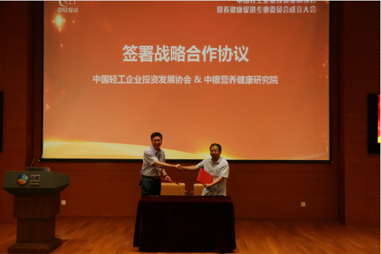 中國(guó)輕工企業(yè)投資發(fā)展協(xié)會(huì)理事長(zhǎng)李國(guó)都先生和中糧營(yíng)養(yǎng)健康研究院院長(zhǎng)助理科技與市場(chǎng)開(kāi)發(fā)部總經(jīng)理鐘鳴先生共同簽署戰(zhàn)略合作協(xié)議,雙方單位共同推進(jìn)營(yíng)養(yǎng)健康產(chǎn)業(yè)工作。