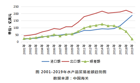 圖 2001-2019年水產品貿易差額趨勢圖 數據來源:中國海關