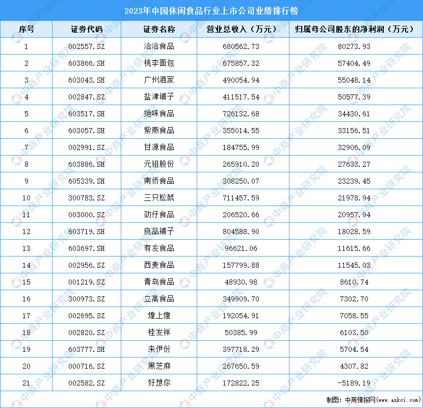 2023年中國休閑食品行業(yè)上市公司業(yè)績排行榜休閑食品行業(yè)共有21家公司公布2023年經(jīng)營情況,21家公司營業(yè)收入合計755.45億元,歸屬母公司股東凈利潤合計51.27億元。其中18家公司營業(yè)收入超10億元,14家公司歸屬母公司股東凈利潤超1億。 營業(yè)收入方面,良品鋪子營業(yè)收入最高達80.46億元,絕味食品、三只松鼠位居第二和第三,營業(yè)收入分別為72.61億元、71.15億元,洽洽食品、桃李面包、廣州酒家、鹽津鋪子、來伊份、紫燕食品、立高食品進入前十,依次排名第4-10名。 凈利潤方面,洽洽食品排名第一,歸屬母公司股東的凈利潤8.03億元。桃李面包、廣州酒家排名第二和第三,歸屬母公司股東的凈利潤分別為5.74億元、5.50億元。鹽津鋪子、絕味食品、紫燕食品、甘源食品、元祖股份、南僑食品、三只松鼠進入前十,依次排名第4-10名。