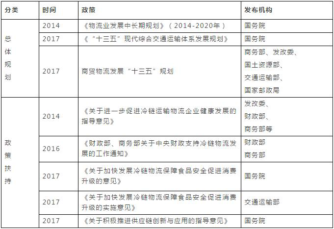二、我國冷鏈物流發(fā)展現(xiàn)狀 (一)國家政策大力支持 近年來,政府層面高度重視冷鏈物流的發(fā)展。僅2017年,國家層面上先后制定出臺了《“十三五”現(xiàn)代綜合交通運輸體系發(fā)展規(guī)劃》《商貿(mào)物流發(fā)展“十三五”規(guī)劃》《關(guān)于加快發(fā)展冷鏈物流保障食品安全促進(jìn)消費升級的意見》《關(guān)于加快發(fā)展冷鏈物流保障食品安全促進(jìn)消費升級的實施意見》《關(guān)于積極推進(jìn)供應(yīng)鏈創(chuàng)新與應(yīng)用的指導(dǎo)意見》《關(guān)于提升餐飲業(yè)質(zhì)量安全水平的意見》等文件,推出了農(nóng)產(chǎn)品冷鏈流通標(biāo)準(zhǔn)化示范城市及企業(yè)試點、評估等活動,從政策、法規(guī)、行業(yè)標(biāo)準(zhǔn)等角度推動了整個物流行業(yè)轉(zhuǎn)型升級,為冷鏈物流行業(yè)發(fā)展提供了積極的政策環(huán)境。(見表3)
