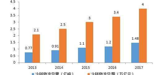 圖2 2013-2017年全國冷鏈物流總量和冷鏈物流總額增長變化圖
