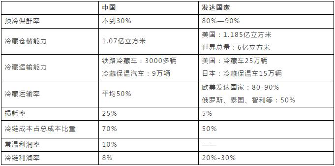 (三)冷鏈物流成本比較 當(dāng)前,我國每年約有20%—25%的果品和30%的蔬菜在中轉(zhuǎn)運輸及存放中腐爛損壞,損壞總量每年高達(dá)上億噸,價值高達(dá)750億元。相比之下,歐美日等發(fā)達(dá)國家和地區(qū)實現(xiàn)了整個冷鏈管理環(huán)節(jié)的成本控制。(見表5) 表5 我國與發(fā)達(dá)國家冷鏈成本