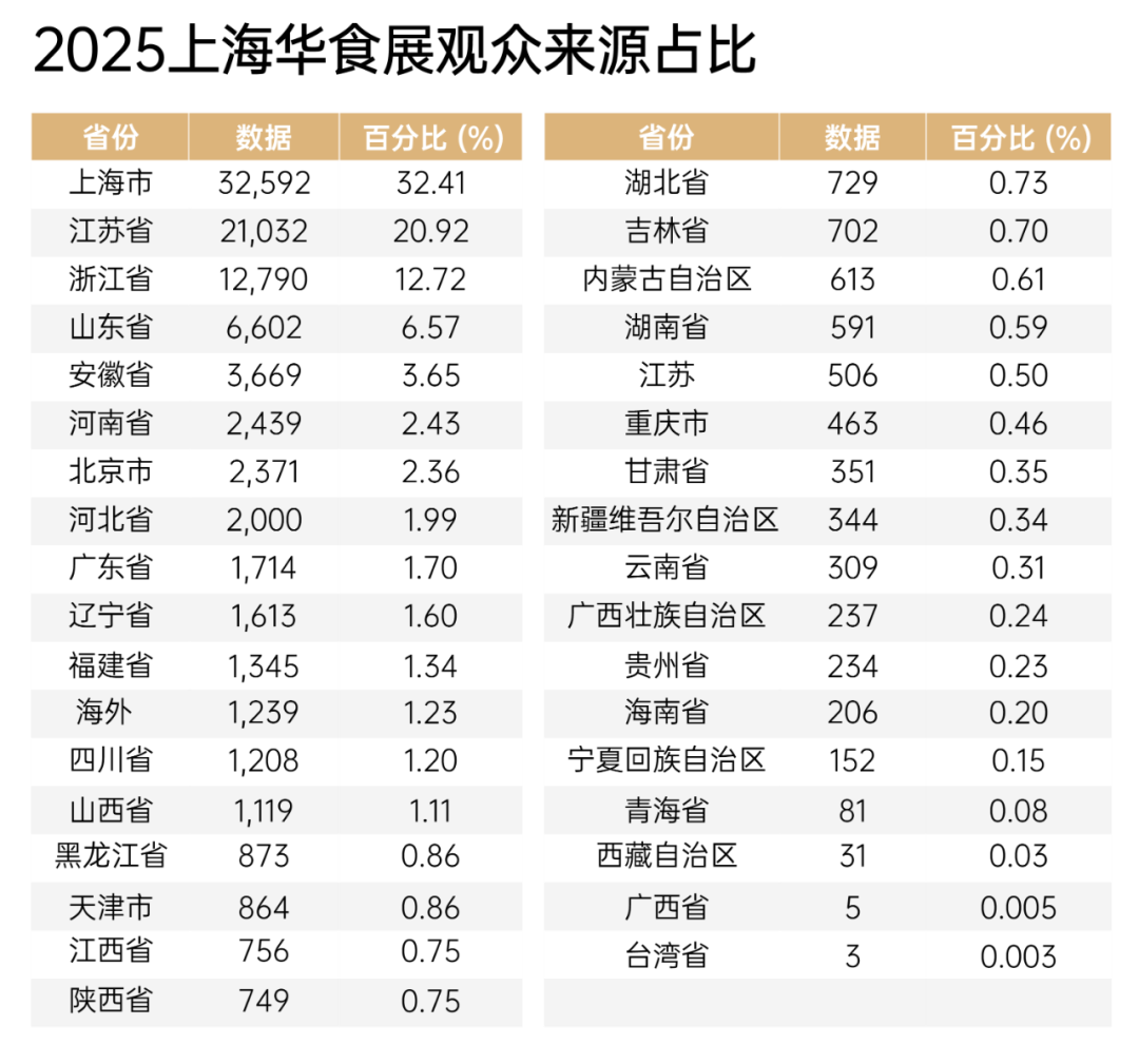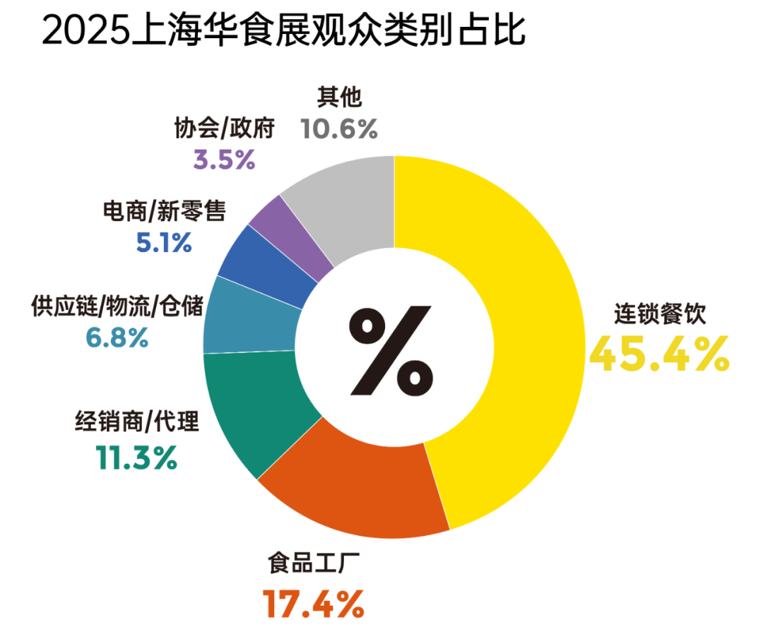 1 截至2024年9月全國門店規模為776.3萬家,區域發展情況來看,華東占到近三分之一的市場 2 中國餐飲第一大區華東,門店規模占比達33.6% 3 中國餐飲第一大市上海,門店規模超20萬 4 中國火鍋行業市場規模2024年為6,175億,同比增長5.6%,預計2025年火鍋市場規模達到6,500億元 5 中國火鍋連鎖化率從2023年初的23~24%的區間逐步提升至超過25%的水平,且50家以上連鎖品牌比重逐步擴大 信息來源:中國餐飲大數據白皮書、中國中式餐飲白皮書、紅餐大數據 2025上海華食展到場付費專業觀眾100,325人,其中華東三省一市(上海、江蘇、浙江、安徽)觀眾占比超66%,且連鎖餐飲觀眾類別占比達45.4%。 ![]() ![]()