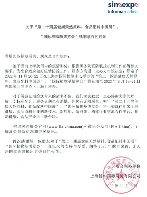 關(guān)于“第二十四屆健康天然原料、食品配料中國展”、“國際植物基博覽會(huì)”延期舉辦的通知