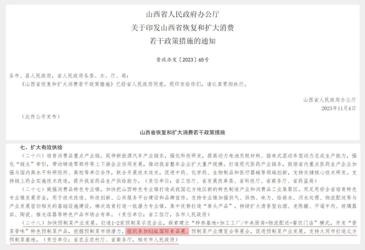 能渡過洶涌浪潮,才能真正踩著風口起飛。SIAL西雅展洞察行業趨勢,愿以國際平臺助力行業高質量發展。在23年滬深雙展中,整合來自原材料、供應鏈、線下餐飲、方便食品/半成品等多領域預制菜頭部企業現場參展,同時廣泛邀約線下商超、電商平臺、餐飲酒店、茶咖/輕食店、便利店等預制菜全渠道目標客戶群現場選品,為預制菜供需雙方提供“一站式”商貿對接服務,成績斐然,獲得了多方認可。在23年11月,山西省人民政府辦公廳出臺的《山西省恢復和擴大消費若干政策措施》中,重點提及“組織參加SIAL國際食品展……促進預制菜產業發展”。