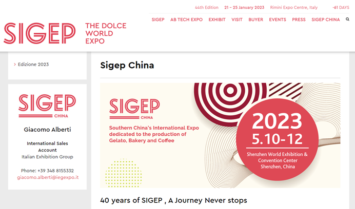 2022年3月15日,意大利展覽集團與德國科隆展覽有限公司就SIGEP的中國展——SIGEP China達成戰略合作。首屆SIGEP China將于2023年5月10-12日在深圳國際會展中心(寶安新館)舉辦,SIGEP China致力于成為中國華南領先的冰淇淋、甜品烘焙和咖啡餐飲業的B2B展會。