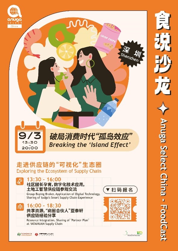 9月3日深圳線下活動(dòng)——Anuga Select China-FoodCast食說沙龍 為了更好地滿足展商與買家的商貿(mào)對(duì)接需求,Anuga Select China世界食品(深圳)博覽會(huì)一直持續(xù)地舉辦線下商貿(mào)活動(dòng)——“Anuga Select China-FoodCast食說沙龍“,助力食飲企業(yè)與品牌及時(shí)獲取最新行業(yè)前沿趨勢,挖掘華南與大灣區(qū)最新市場先機(jī)。